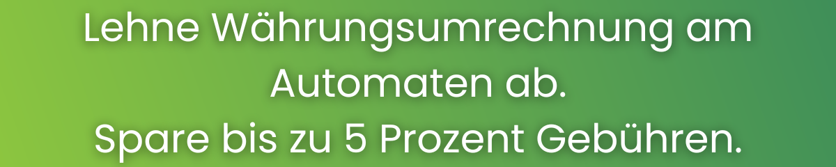 Lehne am Automaten immer die angebotene Währungsumrechnung ab. Manche Geräte bieten dir an, den Betrag direkt in Euro umzurechnen. Das nennt sich Dynamic Currency Conversion und ist immer teurer als die Umrechnung durch deine Bank. Wähle stattdessen die Abrechnung in lokaler Währung.